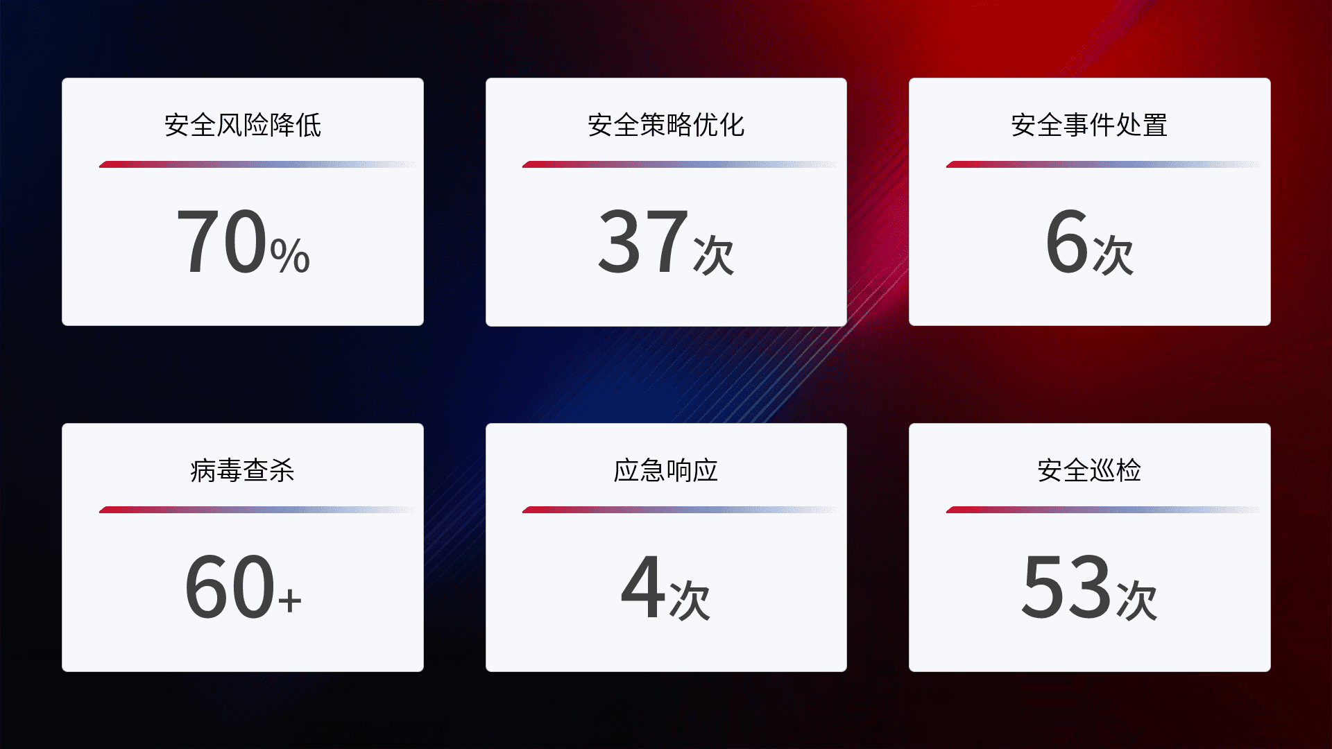 提供全面的安全事件报告体系,,,,包括处置报告、、周报、、、、季度和年度总结,,,,结合持续监控,,,,帮助客户深入了解网络安全状况。。。